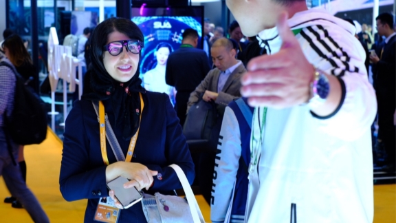 A visitor tries out AR Glasses in the AI zone in CIIE.